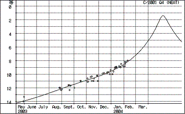2003年8月23日から2004年2月7日までに行なわれた311個の眼視全光度から決定した光度予報式は次のとおり.平均残差は±0.4等.この予報式によると,彗星は,2004年5月17日から18日にかけて,-0.7等まで明るくなるだろう.