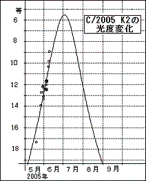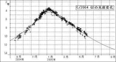 彗星の眼視全光度は,2005年初に図のとおり3等級まで明るくなった(6月10日以後は予報値).しかし,最近でも,まだ,9等級で観測されている.各地の眼視全光度は,5月10日に9.6等(永島和郎;生駒),9.5等(米山誠一;大垣),13日に9.3等(米山),26日に10.5等(永島),6月1日に9.2等(ゴンザレス;スペイン),4日に9.7等(バランスキー;ウクライナ),5日に9.4(ゴンザレス),6日に9.8等(吉田誠一;群馬),7日に10.0等(ビーバ;仏)9日に10.2等(中村一雄;香川)と報告されている(以上,ICQ