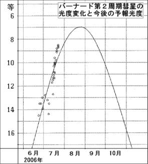最近の光度観測から,その推測が正しいことがわかる.彗星の全光度は,CCD全光度より1.5等級明るいと考えて,発見時から7月上旬まで全光度で13等〜14等級であったものと考えられる.しかし,彗星は,7月中旬には10等級,7月20日前後には8等級まで,急激に明るくなっている.この光度上昇の状況を図に示す.図では,発見直後のCCD全光度を1.5等級明るく設定している.ただし,この影響で,8月下旬の予報光度は約1等級暗くなる.これらの観測から推測される彗星の標準等級はH61= 5.7等となる.予想どおり,明るくなれば,その近日点通過時の8月下旬頃に7等級まで明るくなることが期待できる.この明るさは,上で推定した1889年出現時の光度から推定された光度(7等級)とうまく一致している.従って,彗星の状態に何かの大きな変化がない限り,彗星が7等級まで明るくなるだろう.ただし,現在までの報告では,彗星核は,鮮明なもののその周囲には,大きく拡散したコマが見られている.このため,双眼鏡等の小さな機材で明るく見えている.幸いにも,彗星がもっとも明るくなる8月下旬は,新月で,その近日点通過時も北天りゅう座近くに観測できる.ぜひ,遠来のこの彗星をながめて欲しい.OAA計算課では,1889年と2006年に報告された661個の観測から次の軌道を計算した.軌道改良に使用された最終観測は計算課によるもの.平均残差は0".56(http://www.oaa.gr.jp/~oaacs/nk/nk1355.htm).
